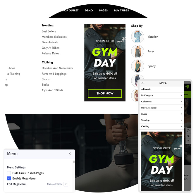 Mega Menu (Advanced) - Multiple columns menu. Besides using Bigcommerce's default menu, you can also use our expanded menu. With Mega menu you can easily added to your menu of the image banners, video clips, paragraph text, static block, etc...