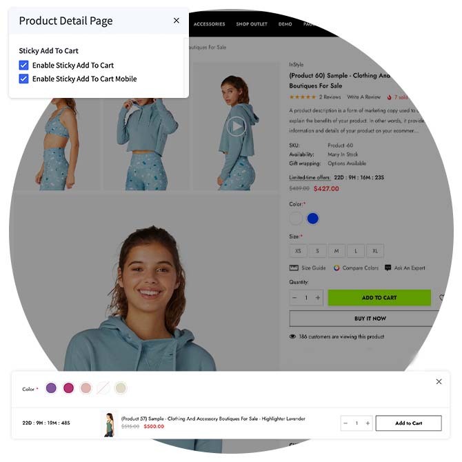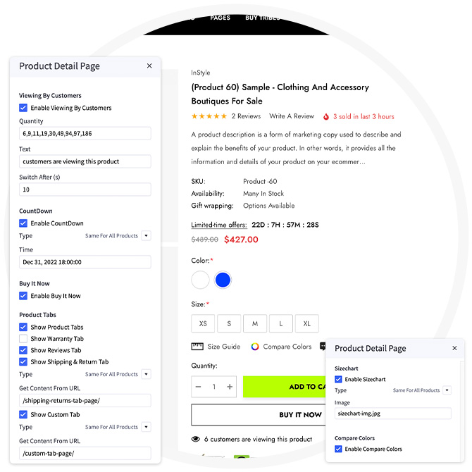 Outstanding features are easily set up in the Product Details Page such as: Sizechart, Compare Colors, Countdown, Buy It Now, Viewing By Customers, Product Tabs,...